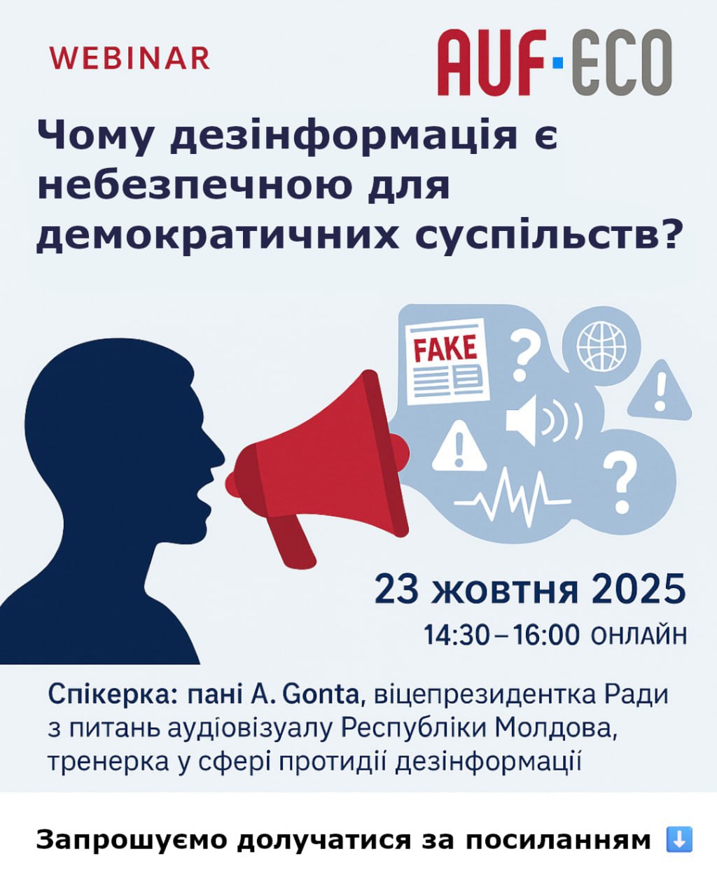 Вебінар буде цікавим для студентів, аспірантів, викладачів і дослідників університетів — членів AUF-ECO, а також усіх, хто цікавиться темою медіаграмотності та захисту інформаційного простору.