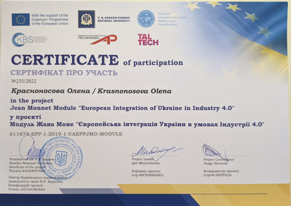 – Харківський національний університет імені В. Каразіна. Сертифікат про підвищення кваліфікації № 235/2022 від 08.07.2022 р. Проєкт Модуль Жана Моне «Європейська інтеграція України в умовах індустрії 4.0». 25.10.2021-08.07.2022 р. Навчальних кредитів ECTS 3,8 (114 годин)