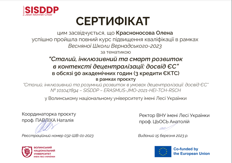 – Волинський національний університет імені Лесі Українки. Сертифікат про підвищення кваліфікації № 032-ШВ-01-2023 від 15 березня 2023 р. Весняна школа Вернадського_2023: «Сталий, інклюзивний та смарт розвиток в контексті децентралізації: досвід ЄС» в рамках проєкт «Сталий, інклюзивний та розумний розвиток в умовах децентралізації: досвід ЄС» № 101047894-SISDDP-ERASMUS-JMO-2021-HEI-TCH-RSCH. Навчальних кредитів ECTS 3,5 (105 годин)