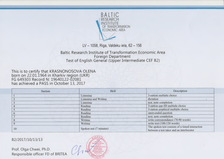 – The International Historical Biographical Institute. Сертифікат про підвищення кваліфікації № 2198 від 12.10.2021 р. ІІ Міжнародна програма підвищення кваліфікації керівників закладів освіти і науки, а також педагогічних та науково-педагогічних працівників. 12.08.2021-12.10.2021 р. Навчальних кредитів ECTS 6 (180 годин).
