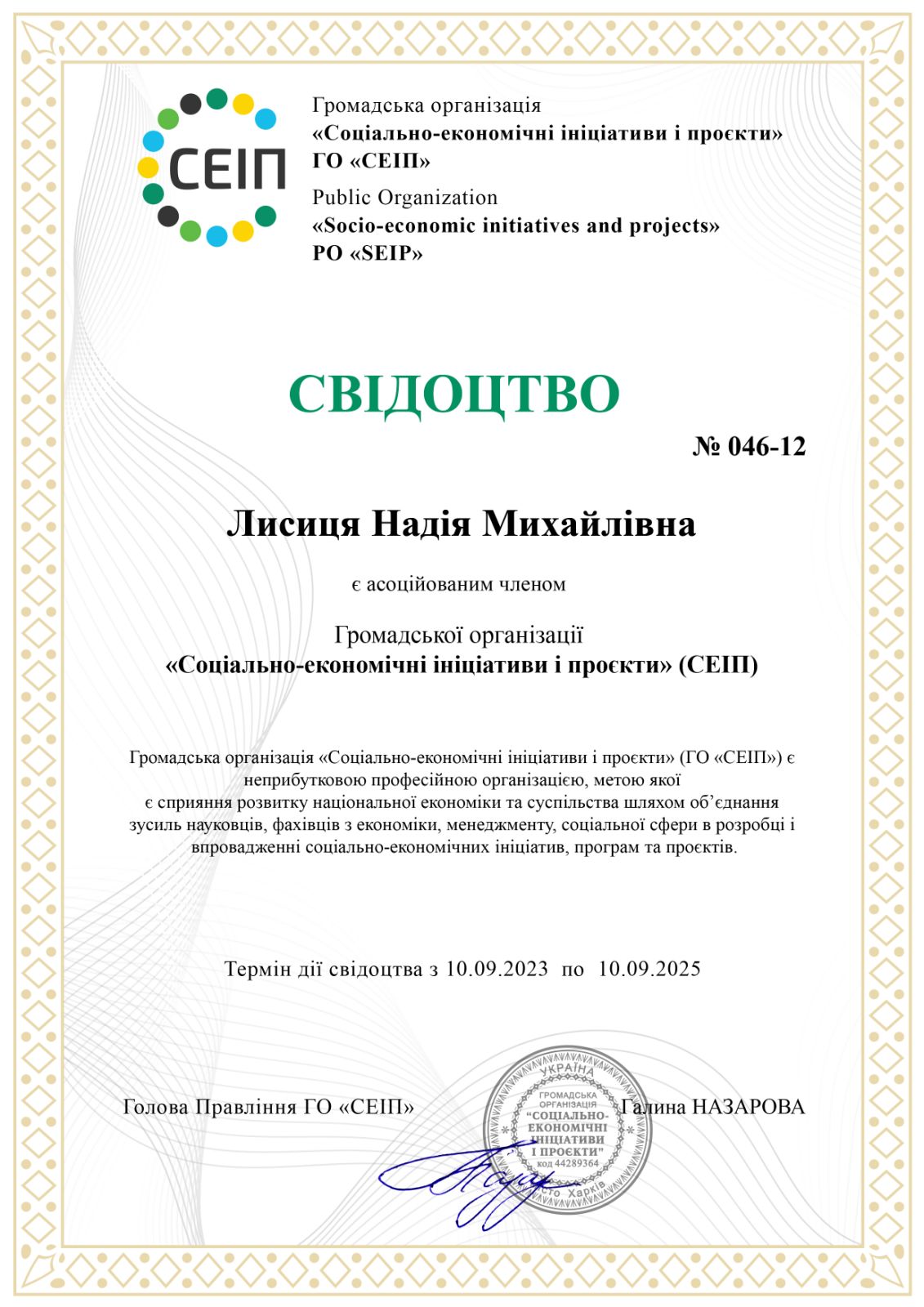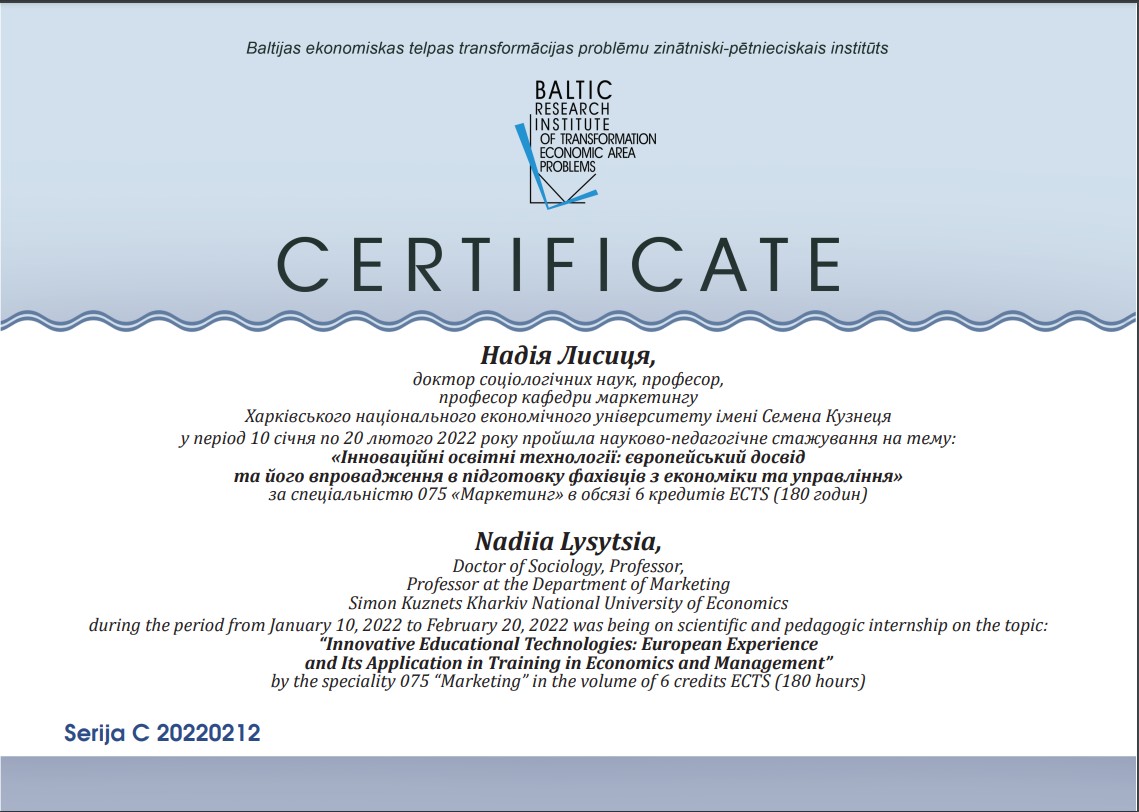 Стажування: проходила стажування у Балтійському науково-дослідному інституті проблем трансформації економічного простору м. Рига : «Інноваційні освітні технології: європейський досвід та його впровадження в підготовку фахівців з економіки та управління» за спеціальністю 075 «Маркетинг» , 2022 та стажування у Лондонському університеті (Великобританія).